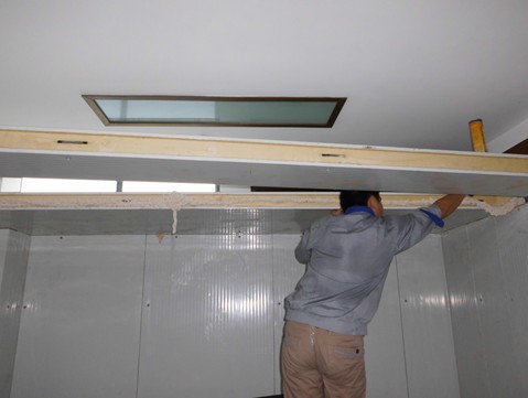 冷庫墻板拼裝完成,準備裝頂板,在裝頂板的同時也是需要先打上發(fā)泡劑,以庫華冷庫的密封性,制冷效果好。
