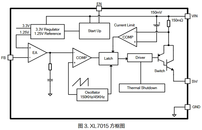 XL7015是一款高效、高壓降壓型DC-DC轉換器,固定150KHz開關頻率,可提供最高0.8A輸出電流能力,低紋波,出色的線性調整率與負載調整率。XL7015內置固定頻率振蕩器與頻率補償電路,簡化了電路設計。PWM 控制環路可以調節占空比從0~90%之間線性變化。內置輸出過電流保護功能,當輸出短路時,開關頻率從150KHz降至45KHz。內部補償模塊可以減少外圍元器件數量。內部框架圖如下~