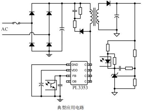 176Vac~264Vac電壓輸入、副邊反饋的隔離電源。PL3353內部集成了700V功率開關、高壓啟動電路和電流采