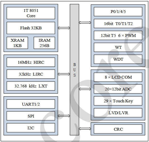 時鐘系統:芯片內置 16MHz 的高速振蕩器(HIRC)和 32kHz 的低速振蕩器(LIRC),同時支持外部低速晶振(LXT)輸入,最高可達 32.768kHz。這些時鐘源為系統提供了靈活的時鐘選擇,以適應不同的工作模式和功耗要求。
