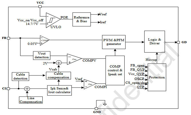 | 4 | CS | 原邊電流檢測,500 mV 閾值,350 ns LEB |