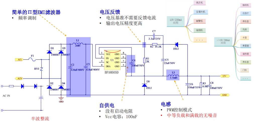 BPA8505/BPA8506系列是晶豐明源針對小功率非隔離電源市場推出的高性價比方案,通過內(nèi)置650V高壓MOS、極簡外圍、智能多模式控制,實現(xiàn)了125mA~450mA輸出范圍的完整覆蓋。相比傳統(tǒng)阻容降壓方案,具有效率高、待機(jī)功耗低、安全性好的顯著優(yōu)勢;相比外置MOS的Buck方案,又具有成本低、體積小、設(shè)計簡單的特點。