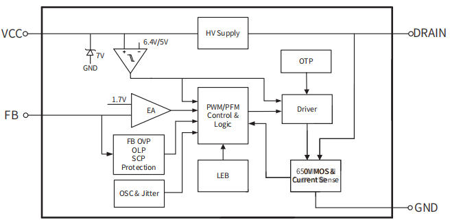 | 內(nèi)置高壓MOSFET | 650V耐壓,RDS(on)約1.5Ω(典型值) |