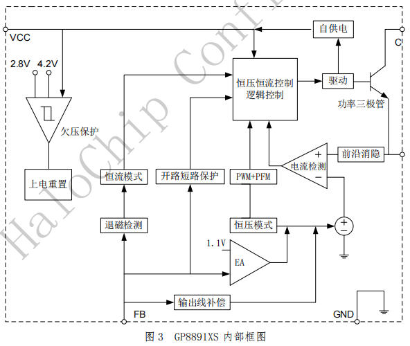 芯片內(nèi)部集成高壓?jiǎn)?dòng)電路,上電后直接從高壓母線取電為VCC供電,無需外部啟動(dòng)電阻。當(dāng)VCC電壓達(dá)到啟動(dòng)閾值(典型4.5V)時(shí),芯片開始工作,之后由輔助繞組供電。