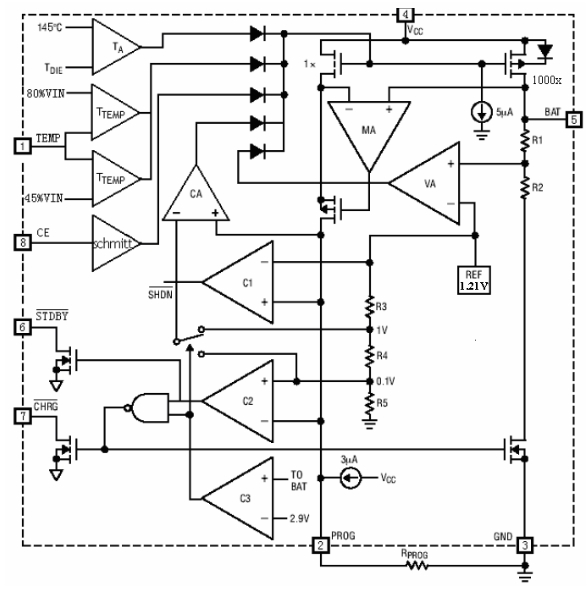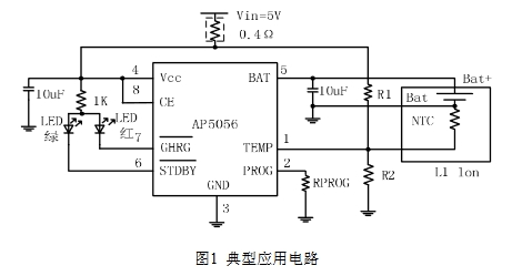 充電電壓被固定在4.2V,充電電流可通過外部電阻設(shè)置。當(dāng)充電電流在達到最終浮充電壓之后降至設(shè)定值 1/10 時,AP5056 將自動終止充電循環(huán)。當(dāng)輸入端(適配器或USB電源)拔掉后,AP5056自動進入低電流狀態(tài),電池漏電流將降到2μA以下。AP5056還可被設(shè)置于停機狀態(tài),使電源電流降到50μA。其余特性包括:電池溫度監(jiān)測,欠壓鎖閉,自動再充電和兩個狀態(tài)引腳以顯示充電和充電終止。