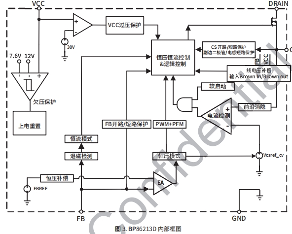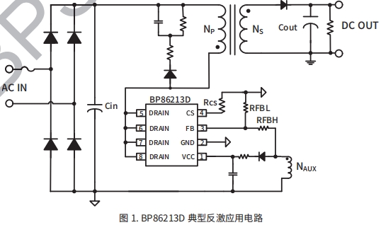 BP86213D 芯片集成650VMOSFET、高壓啟動和供電電 保護功能 路。采用PWM/PFM多模式控制技術,從輔助繞組給VCO 輸入欠壓保護(Brown-in/out) 供電,能有效降低系統待機功耗,提高效率和動態性能, 并減小系統工作在輕載時的噪聲。