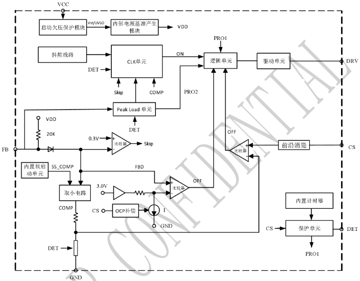 軟啟動功能:LP8776CD內置典型值9mS的軟啟動功能,通過在啟動階段逐周期增加VCS保護閾值的方式實現,有利于避免變壓器的飽和和降低副邊二極管的應力,從而提高耐壓性能。